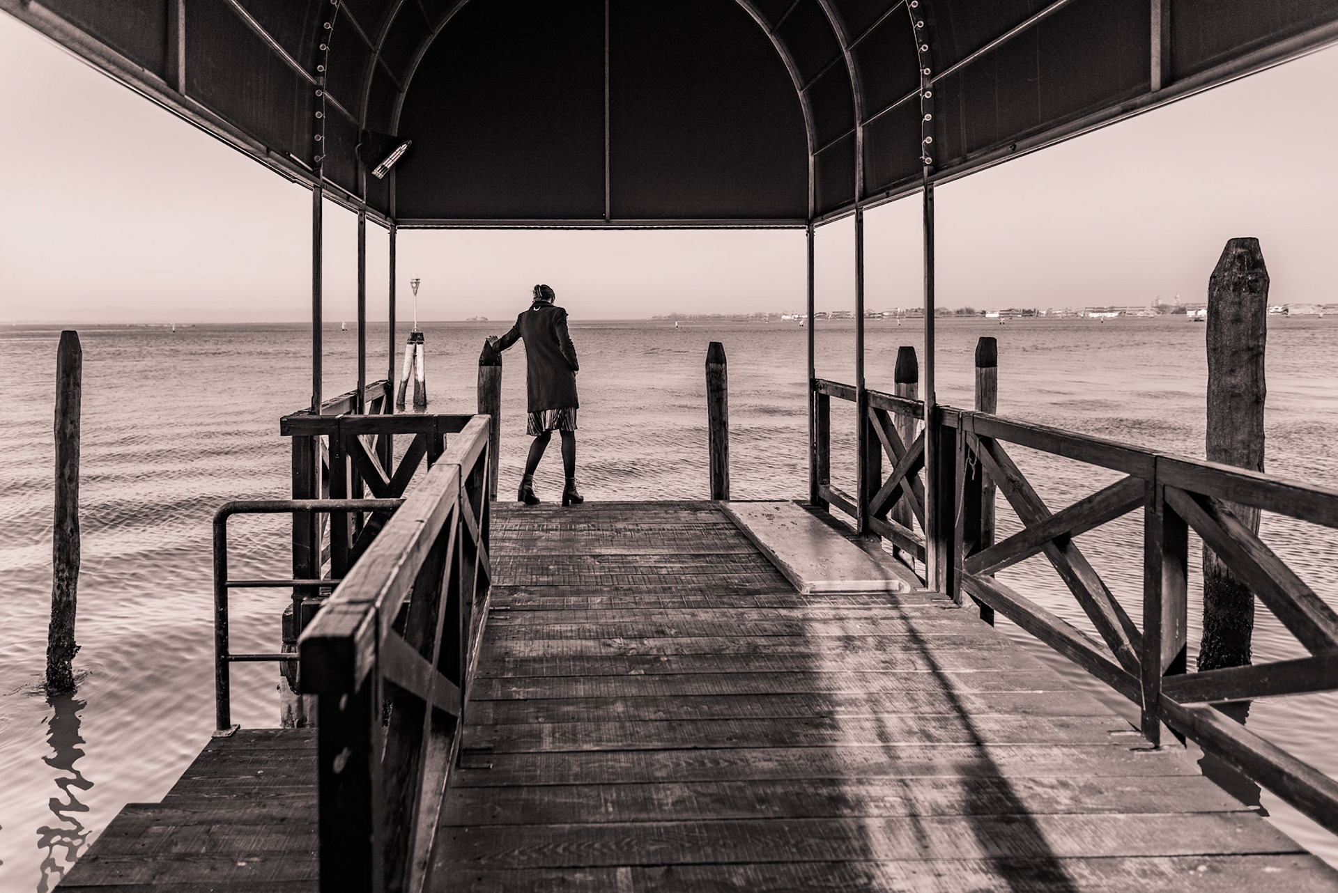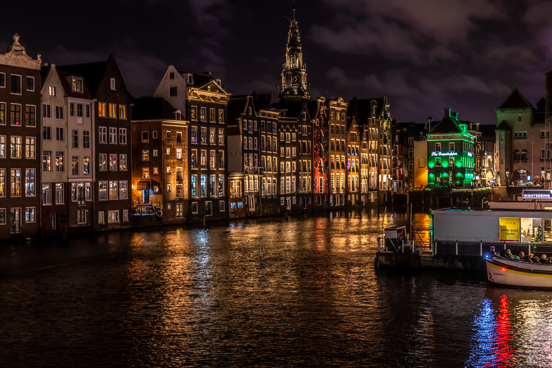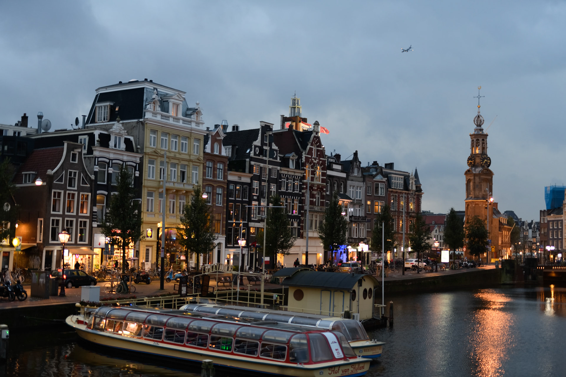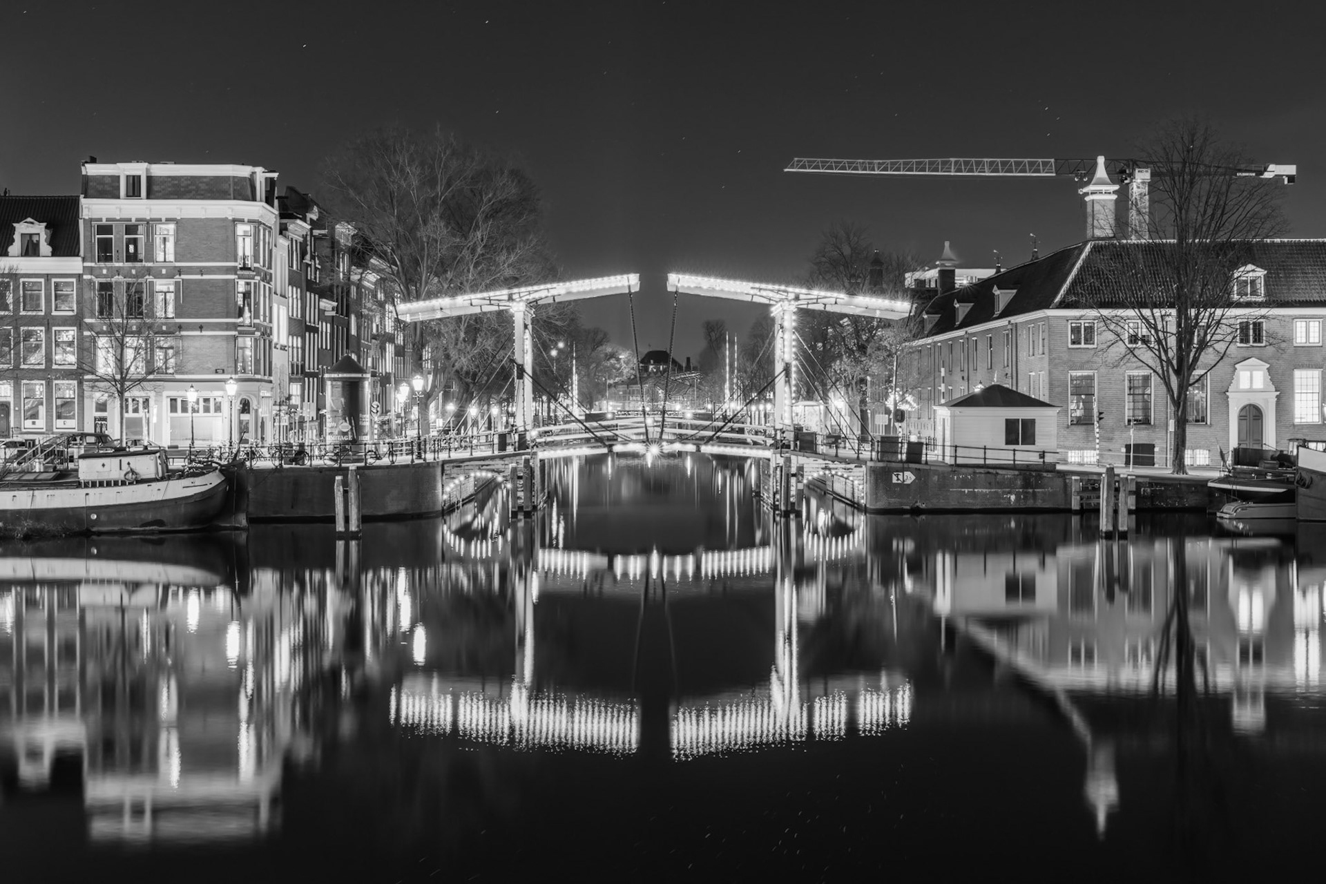 A young woman composs a photo of Magere Brug, from Blauw Brug, Amsterdam
