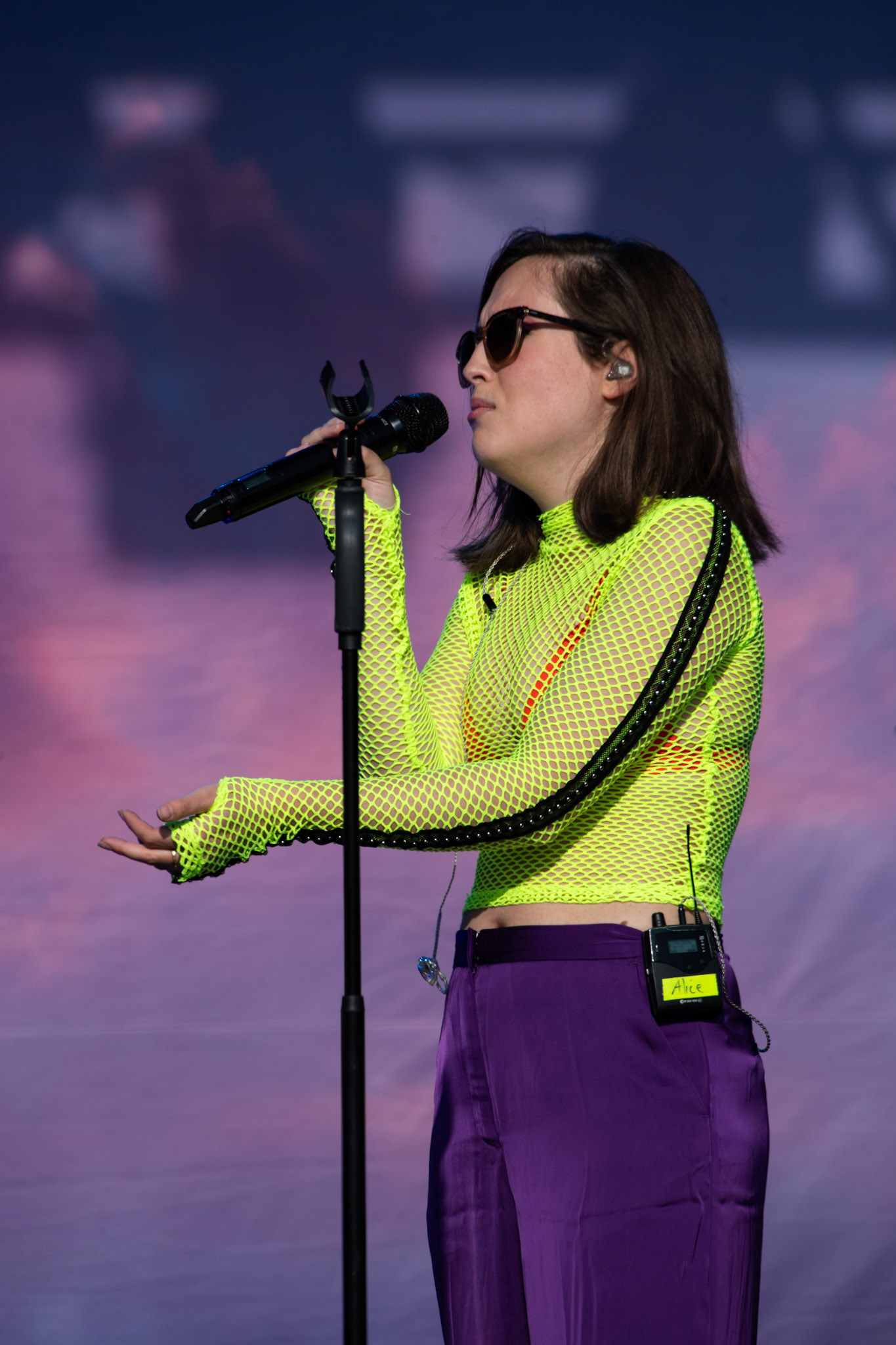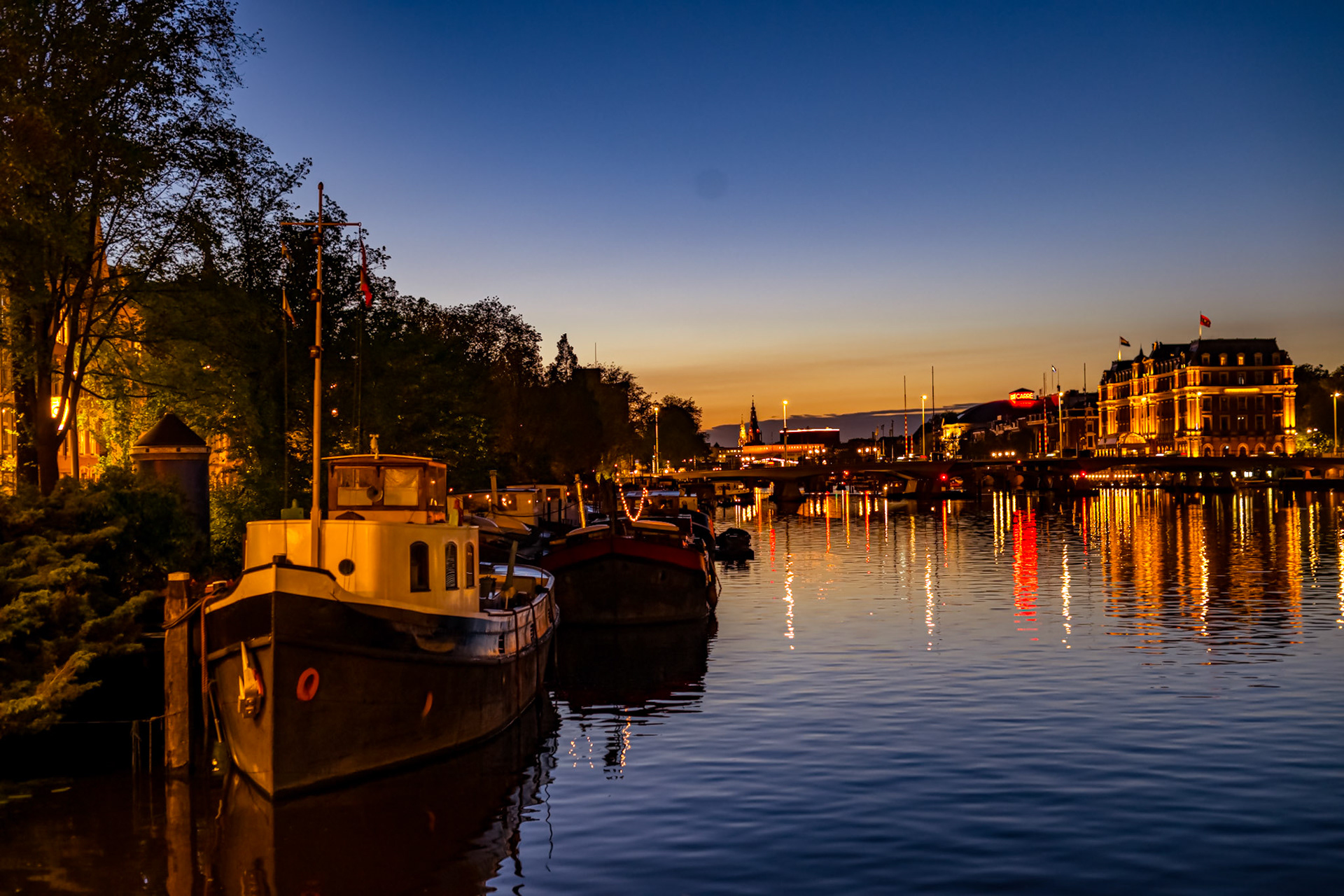 A young woman composs a photo of Magere Brug, from Blauw Brug, Amsterdam